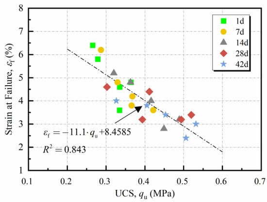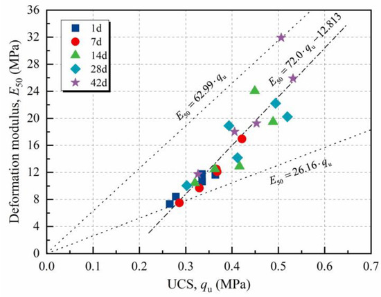 where both and were expressed in MPa. The regression analysis yielded and with . It is noteworthy that the intercept for NM-treated loess was negative, unlike the traditional zero-intercept model for cement-treated clays. This was probably due to the relatively weak strength and high ductility of the bonding force formed by NM, compared with that formed by cement. Consequently, the NM-treated loess exhibited high strength under relatively low stiffness, resulting in the negative intercept .