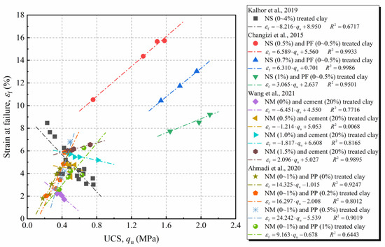 Figure 10 exhibits the data of nano-SiO2 (NS)- and nano-MgO (NM)-treated clays extracted from the literature [22,31,37,53]. Twelve pairs of and were fitted according to Equation (2), and the fitting results are exhibited in this figure. It was observed that changed with as a linear function in almost every case. The higher determination coefficient, R2, indicated the linear expression may be suitable to describe the – relationship of nanomaterial-treated soils. Notably, the parameter was negative for the cases where only NS or NM and cement were added. It was consistent with the observation of NM-treated loess in this work. However, as fibers were added, it was interesting to note that the parameter turned positive. It indicated that adding fiber impacted not only on the strength, but also on the – relationship. This phenomenon might be attributed to the good ductility of fiber-treated soil, which endowed them with larger failure strain and corresponding higher UCS. In terms of , it is positive in most cases, just the same as the results in this work. This is in accordance with the theoretical analysis, because UCS cannot be reached at 0% strain. For the cases of Ahmadi et al., the presence of negative value indicated the obtained expression was not applicable in the lower UCS level.