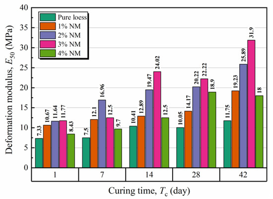 As previously discussed, the NM-treated loess exhibited elastic–plastic behavior like most geo-materials. Normally, this behavior can be described by the deformation modulus, , which is expressed as the ratio of stress to strain when the strain is at half of . Figure 11 illustrated the effects of NM and curing on the deformation modulus. Generally, the deformation modulus of NM-treated loess was in the range of 7.33 to 31.9 MPa. It presented a rising tendency with increasing curing time and a “rise-fall” tendency with the addition of NM. Notably, these tendencies were similar to that of UCS in Figure 6, which indicated a probable link between and .
