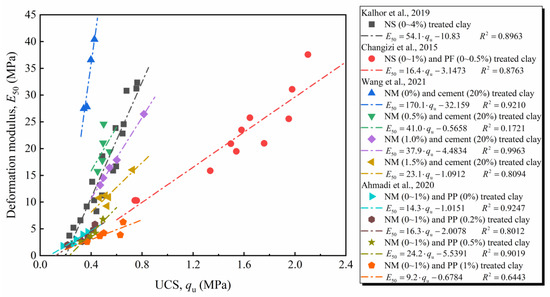 Relationship between deformation modulus and UCS of nano-material-treated clays extracted from literature (Kalhor et al., 2019; Changizi et al., 2015; Wang et al., 2021; Ahmadi et al., 2020) [22,31,37,53].