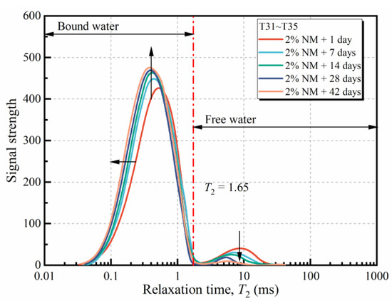 Figure 14 depicts the T2 spectra of NM-treated loess with varying NM dosages. Since the relaxation time is inversely proportional to the surface tension, the T2 spectrum curve could be used to reflect the states of water in soil samples. According to He et al. [57], for loess soil, the cutoff T2 value corresponding to bound-water and free-water was at 1.65 ms (red line). That is, the left/right side area under the T2 curve reflected the amount of bound-/free-water, respectively. As exhibited in Figure 14, the curves for all cases could be roughly divided into two peaks, P1 and P2, which were respectively located in the left side and right side of the red line. Notably, the left side peak P1 was dominating, which denoted that most of the water contained in the soil belonged to bound-water. An increase in NM content led to an increase in P1, yet a decrease in P2. The left-shift of the T2 curve with the addition of NM was also noticed. The above phenomena indicated the rising share of bound-water with increasing NM and curing. It could be attributed to the excellent surface effect and hydrophilicity of MgO nano-particles, which attracted more water molecules to make the proportion of bound-water enhanced [58].