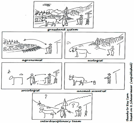 A second method is implied in Geertz’s search for other perceptions/scapes, to be clubbed under the term ‘system literacy’. Color of a soil, behavior of an animal and/or growth of a particular weed can tell farmers what is going on in their farm. Work in early participatory Farming Systems Research looked for such ‘symptoms’ and alternative ‘scapes’ [55,60,61]. That approach first took hold in tropical Farming Systems Research [53]. But [62] tells how children in Australian Landcare programs were sent home (from their biology lessons) to ask their parents about species lost and gained in their lifetime. At first, that confused parents, but the ensuing crash and successive ‘collapse of chaos’ resulted in increased awareness of communities of environmental aspects. It even triggered (emergence of) action to (re-)install notions of stewardship. Similarly, a field visit in India taught one of us (Johannes B. Schiere, henceforth JBS) that ‘scapes based on labor films’ were a bigger issue for farmers than ‘scapes based on feed fiber contents’. Another example of emerging system literacy is a Dutch work to develop software for decision-making on fungus control in wheat, which involved farmers counting number of infections. The result was that farmers had learnt the trick by the time the software was in place [63,64]. These are all great cases of ceteris imparibus and behavior of CAS. Farmers in Southern Australia were shaken up and initially confused when they realized that 40 kg of topsoil was lost for every kilogram of wheat produced. The collapse of that chaos was towards a significant change and mindset regarding cultivation practices (Peter Doyle, pers. comm.). The crash due to the US Dustbowl [41] similarly opened eyes of ‘teaching’ communities and individuals to reconsider their farming practices, to include other scapes and/or to re-read their ecologies. It shook people from their comfort zones and ensuing ‘collapse of chaos’ led to adjusted thinking and acting on farming. Environmental dramas such as those should be avoided, but they achieve awareness on use of hitherto unthought ‘scapes’, beyond moldboard plows and planting of ever more cotton (People first looked at failing rains (‘something’ beyond their own reach), but eventually they started to look at their own role in affecting such drama, a shift from systematic to systemic thinking). Acid rains had a similar effect on rethinking and redesigning intensive livestock farming in Western Europe in the eighties [33]. As a typical case of ‘questions having more than one answer’ (see ‘the fan’ in Section 5), some farmers modified the intensive mode; others redesigned farms and food chains in different ways, and still others left farming altogether. One may hope that recent bushfires in Australia and across the western US have an effect on reconsidering paradigms and choice of ‘scapes’. And what will we learn of the collapse of chaos after the current COVID-19 pandemic? And how will lobbies respond that tend to defend the status quo? One of us (JBS) learnt a lesson in system literacy when asking a colleague (Wijnand Sukkel) to stroll through a potato field that JBS had just then started with his wife. Sukkel was asked to spot things that JBS had not thought of, and one question was on whether JBS had seen Colorado beetles yet. The reply of JBS was ‘no, not yet’, upon which Sukkel showed small (black) larvae that would grow into beetles if nothing were changed. It opened the eyes of JBS to things unknown (not being a potato man at that stage). A very special final case of ‘system literacy’ and inclusion of other ‘scapes’ is work by Temple Grandin, a remarkable and autistic lady. She tries to understand animal behavior from her own autistic point of view by even crawling through the slaughtering lanes to see (i.e., by inviting mess) what animals experienced. She changed part of the US meat industry on key aspects of animal welfare [65]; www.grandin.com, accessed on 14 February 2023. How many of us crawl, as did Temple Grandin, on a pasture to see how cows experience herbage?