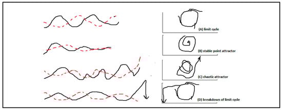 An artist impression of four basic shapes of the predator–prey model, with the ‘wave’ representation to the left and the associated attractors to the right. Red dashed line is population size of the predator (fluctuating of course) and black line represents the fluctuating population size of the prey (vice versa same story). Note 1: conversion from ‘wave’ (left) to attractor (right) shapes is relatively easy [23,49]. The wave shape does plot both predator and prey numbers on the vertical axis against time on the horizontal axis. The phase space diagrams (attractors) to the right plot the predator population on the vertical axis and the prey population on the horizontal one, with time within the attractor. Note 2: the basic shapes are known as limit cycle (dynamic equilibrium) where the ‘wave’ continues rather in the same way and irrespective of (reasonable) internal/external disturbance. The stable point attractor represents a wave where the amplitude ‘dampens out’. That leads to a stable equilibrium which underlies equilibrium thinking, as in mainstream economics where temporary irregularities dampen out into a stable situation, also called climax vegetation in ecology. Chaotic attractors have less regular behavior (wave) and in the ‘breakdown’ of the limit cycle a crash occurs when for example the predator grows even if no predator is left. Note 3: Cutting corners one may say that the top row wave has a relatively large resilience ‘elasticity’/amplitude versus low stability (large deviations from the equilibrium line). The equilibrium wave (second row) has little bouncing (low resilience) and high stability. Trade-off here is that stability (achieved against the odds of variation) implies low resilience and vice versa.