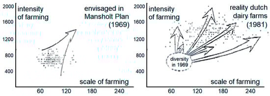 So-called ‘cross-hair’ diagrams with trade-offs between traits and scape properties, here all on a time scale of—locked in—development (Figure 6 Breman for such diagrams on spatial scales). With time (in the left-hand diagram) a continued emphasis on fodder digestibility led to great increases (management and breeding), accompanied by a decrease in C/N ratio which implied greater risk of nitrogen leaching. Greater emphasis on individual milk yields (middle diagram) can lead to lower fitness in the animal (or need for more support systems in terms of veterinary care, medicine, intensive management). The continued larger scale of farming in the right-hand diagram is associated with less ‘political’ support in the communities. That can result in even hostile relations between farmers and ‘urban-based’ people that ‘take over’ the rural areas, often with demands for ‘more nature’ and arguments on who must pay for that. Win-win is unlikely to occur across the board. Or also: a gain on one aspect is thus likely to represent a loss somewhere else, generally overlooked with a too narrow ‘reductionist’ focus. And the lock-in on one aspect with untimely action on ‘side-effects’ implies a larger lag time, which in ‘chaos’ terms implies greater crash. Note: The top characteristic in the figure grass digestibility, etc., reflects the left y-axis and the lower characteristic reflects the right-hand y-axis. Also, the ‘cross-hairs’ are represented as straight lines that intersect somewhere in the middle. That is a simplification, among others because the lines may be curvilinear and because the point of intersection depends on the scales chosen on the y axes (text and Figure 7).