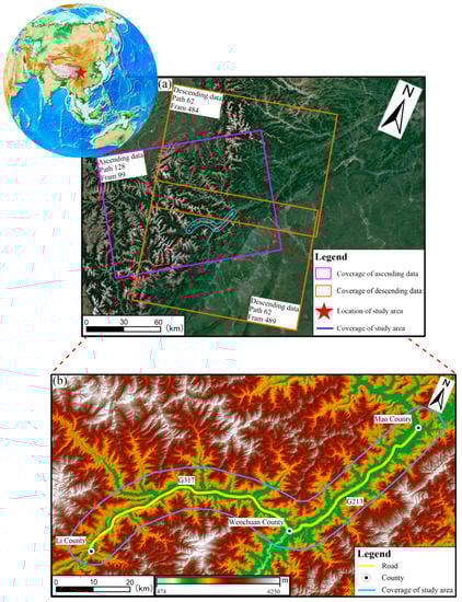 - Dong, J.; Zhang, L.; Li, M.; Yu, Y.; Liao, M.; Gong, J.; Luo, H. Measuring precursory movements of the recent Xinmo landslide in Mao County, China with Sentinel−1 and ALOS-2 PALSAR-2 datasets. Landslides 2018, 15, 135–144. [Google Scholar] [CrossRef]