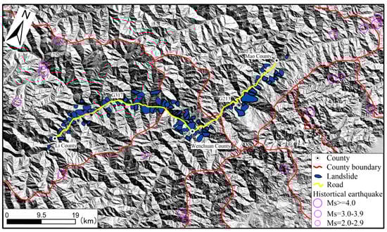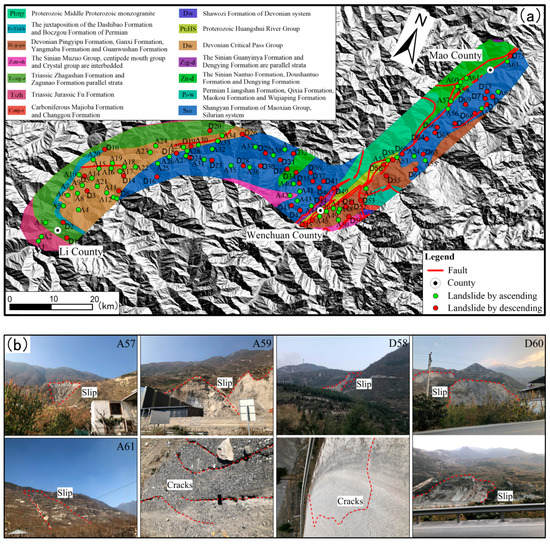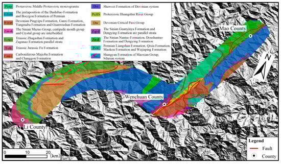 The study area in this paper is along the National Highway (G213 and G317) from Mao County to Li County, Sichuan Province, which spans Mao County, Wenchuan County, and Li County, with a total area of about 864 km2. The study area is located in the eastern Qinghai–Tibet Plateau region of the upper reaches of Minjiang river, on the landscape which belongs to the mountains and steep terrain slopes. The relative elevation difference is big, with an altitude of 474–6250 m, an average elevation of 3362 m. The gully aspect has the typical geomorphic features of alpine valleys (Figure 1b), with regional faults (fold and fault are a sign of tectonic activity) [18]. There are four main fault zones, namely, the Xiongershan fault zone and Pingtoushan fault zone in Li County, and the steep-up fault zone and Maowen fault zone in Wenchuan County and Mao County (Figure 2). The stratigraphic development in Figure 2 includes Proterozoic (Middle Proterozoic monzogranite, grey-greenish-fuchsia basic-medium acid volcanic rocks, clastic rocks, carbonate rocks), Permian system (lower volcanic lava, pyroclastic rock, upper tuffaceous sandstone, carbonate rock, bottom shale, siltstone), Devonian system (lower clastic rock, upper carbonate rock, greyish white limestone, bioclastic limestone, intercloud limestone, algal limestone, greyish black metamorphic mud, sand, carbonaceous rock, inter-carbonate rock), Sinian system (metamorphic sandstone, mellite, crystalline limestone, dolomite, lower sandstone, shale, conglomerate, sandy shale, dolomite), Triassic system (metamorphic sandstone, SLATE, limestone, dark gray thin-thick metamorphic feldspar quartz sandstone, pebbled sandstone and carbonaceous SLATE interbedded), Carboniferous (limestone mixed mudstone, argillaceous limestone), and Silurian (green sericeous SLATE, sandy limestone, quartz sandstone).