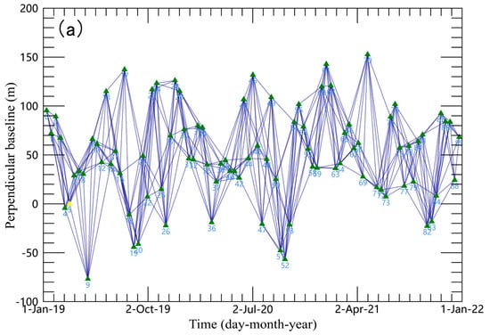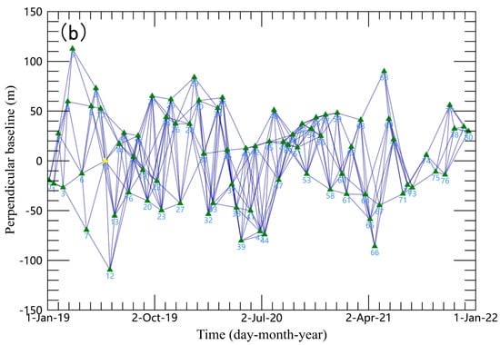 In the process of processing the data, the ENVI@SARscape software was used for data processing. The image of 10 March 2019 was used as the super main image for the ascending data, the image of 28 May 2019 was used as the super main image for the descending data, and the remaining image was used as the auxiliary image for registration with the super main image. The time baselines of ascending data and descending data are controlled within 60 days, and the space baselines are controlled within 180 m and 120 m, respectively. A total of 427 interference pairs were generated by free combination of ascending data and 324 interference pairs were generated by free combination of descending data. The spatiotemporal baseline connection diagram of the ascending and descending data is shown in Figure 3.