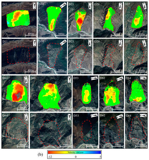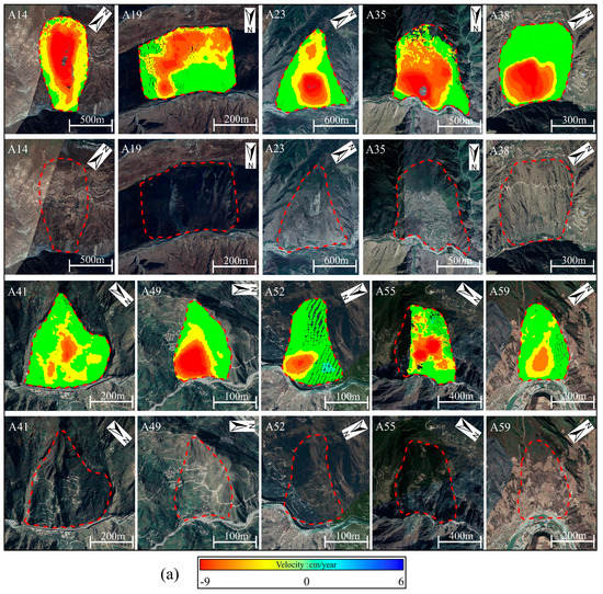 (a) Sentinel−1 ascending data enlarged deformation rate maps and optical remote sensing images of 10 exemplary landslides; (b) Sentinel−1 descending data enlarged deformation rate maps and optical remote sensing images of 10 exemplary landslides. The red solid lines indicate the boundaries of the landslides. The optical remote sensing images were sourced from the Google Earth platform.