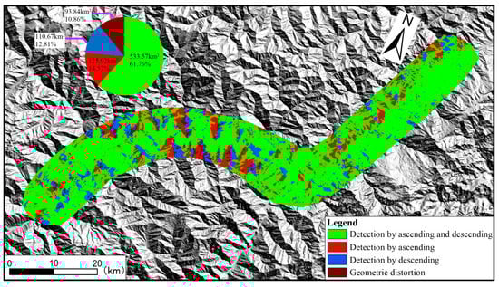 As the study area is located in the mountainous areas of southwest China, the terrain is steep, so there are inevitably geometric distortions in the study area [32]. Because of the difference of slope and aspect along the National Road (G317 and G213) from Mao County to Li County and the difference of the orbit flight Angle of Sentinel−1, the distribution of geometric distortion has regional differences. The research results of this paper show that the deformation results vary with different orbits (Figure 5 and Figure 6). In order to quantitatively evaluate the geometric distortion distribution and characteristics of the ascending and descending Sentinel−1 data, the geometric distortion distribution and suitability of the study area can be accurately calculated based on the original image data and imaging parameters, as shown in Figure 9 and Figure 10.