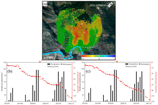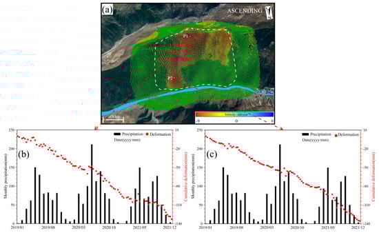 Relationship between slope deformation and precipitation for the Qijiazhai landslide with ascending data. (a) Annual deformation rate from 9 January 2019 to 24 December 2021; (b) time series deformation of Point P1 against monthly precipitation; and (c) time series deformation of Point P2 against monthly precipitation.