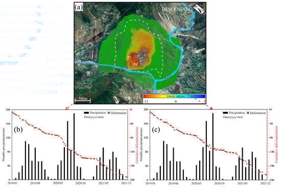 Relationship between slope deformation and precipitation for the Sanchang village landslide with ascending data. (a) Annual deformation rate from 4 January 2019 to 13 December 2021; (b) time series deformation of Point P5 against monthly precipitation; and (c) time series deformation of Point P6 against monthly precipitation.