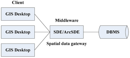 With the maturity of other computer technologies, the basic functions of geographic information systems have been further expanded. In addition, society’s understanding of geographic information systems has gradually increased, and the demand has also increased significantly, which has caused the application of geographic information systems to receive widespread attention, and the research content has continued to expand and deepen. The architecture of the client–server model is shown in Figure 1 [5].