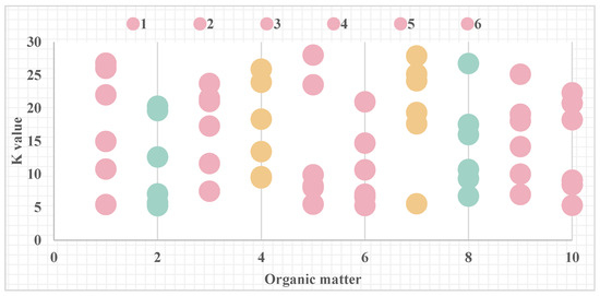 Because factor ecological analysis is an analysis method in the category of induction, it requires multivariate statistical analysis, and the selection of variables must be universal and relatively comprehensive. In the research of urban social space, most scholars choose urban demographic data as social factors. The research on rural social space emphasizes the network space of daily practice behavior. Therefore, the selected influencing factors involve population, residence, employment, schooling, etc., while taking into account the spatial attributes of rural social space, the spatial distance and topography are considered. The addition of factors can better reflect that rural social space is a spatial manifestation of rural residents’ daily life practice. The correlation between the soil erodibility K value and organic matter content is shown in Figure 6. The formation and change of rural settlements are often affected by multiple factors. The impact of various indicators on the settlement distribution is also different, so it is necessary to grade and assign weights to the indicators and explore the significant degree of correlation between the impact factors and settlements, as well as between different impact factors. From the perspective of temporal variation characteristics, the overall spatial differentiation has little change, but the differentiation pattern has changed. The K value of the agricultural production function index of each township is 10.714, with an average of 20.715, indicating that the agricultural production function index of each township is rising over time. From the perspective of spatial distribution, it is strong in the middle and low on both sides. Specifically, the coefficient of variation of the rural life guarantee function in Yongtai County is greater than 0.5, which indicates that its spatial differentiation is obvious. The first-level functional areas of the life guarantee function include Zhangcheng town and Chengfeng town. The second-level functional areas of the life support function include Dayang Town, Tongan town, and Wutong Town, all located in the central part of Yongtai County. The level III functional area of the life security function includes five townships, which are mainly located in the periphery of level I and II functional areas. The level IV functional area of the life security function includes 11 townships, with the proportion as high as Yongtai County, and the number of townships is generally above. From the perspective of time change, the ecological pattern of Yongtai County is relatively stable, and the change in the functional index is not obvious.