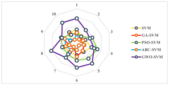 The test results of the GWO-SVM model are compared with the results of the PSO-SVM, GA-SVM, and ABC-SVM models. The classification results are shown in Table 6 and Figure 7. SVM (support vector machine) refers to support vector machine, GA-SVM refers to genetic algorithm optimization support vector machine, PSO-SVM refers to particle swarm optimization support vector machine, ABC-SVM refers to intelligent bee colony optimization support vector machine, and GWO-SVM refers to gray wolf optimization support vector machine. The results show that GWO-SVM has good classification performance. Its cross-validation rate reaches 91.66%, and the recognition rate of test samples reaches 82.41%. Both the cross-validation rate and the recognition rate are the best among several comparative models. It shows that the use of GWO-SVM has better evaluation accuracy for the evaluation of small sample datasets. When the sample distance is greater than the range, the samples become completely independent.