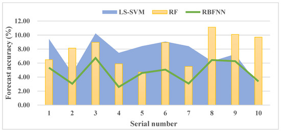 The prediction accuracy evaluation of the model is shown in Table 7 and Figure 10. It can be inferred from the results that the prediction accuracy of the three prediction models is more than 88%, and the radial basis function neural network prediction model is better than the least squares support vector machine prediction model and the random forest prediction model. From the prediction accuracy of different soil layers, the prediction effect of the least-squares support vector machine prediction model and radial basis function neural network prediction model in the 0~20 cm soil layer is better than that in the 20~40 cm soil layer, which may be caused by the more obvious effect of meteorological factors on surface soil and the heavy influence of meteorological factors on all prediction factors; however, the prediction effect of the random forest prediction model in the 20~40 cm soil layer is slightly better than that in the 0~20 cm soil layers. Through the accuracy analysis and comparison, it can be found that the radial basis function neural network prediction model has the best prediction effect in this study area.