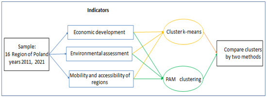 The research made use of mass statistical data from the Local Data Bank (LDB) [48], the Poland’s largest database of the economy, society and the environment, with data from 1995. The LDB delivers over 40 thousand statistically grouped thematic indicators according to the NUTS nomenclature [49]: macro-region, region and sub-region. Figure 1 summarizes the flow of the methodology.