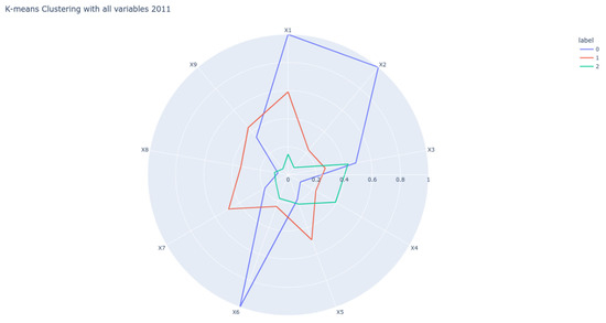 Figure 3 shows the classification of the regions in 2011 according to the nine indicators. The blue color represents cluster 0, where we can see highest values in indicators X1, X2, X3 and X6. Cluster 1 is represented with the red color, and the medium values in indicators X1, X2, X4 and X6, and the highest value in X5, X7, X8 and X9. Cluster 2 is represented with the green color, with the lowest values in indicators X1, X2, X6 and X9, and the highest value in X4.