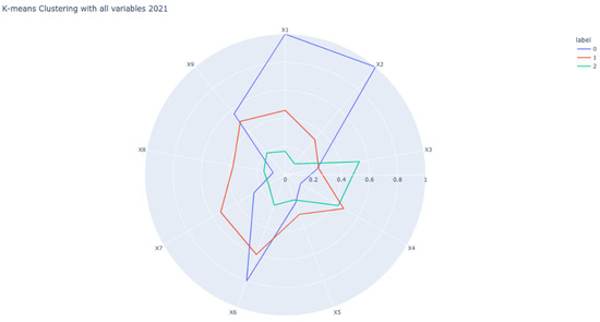 Figure 4 represents how the classification of the regions was in 2021, according to the nine indicators. Cluster 0 still had the highest values in the same indicators X1, X2 and X6, and improved the indicator X9. Cluster 1 is represented with the red color, and the medium values in X1, X2, X6 and X9 indicators meant improvement in X6, and still a higher value in X4. Cluster 2 is represented with the green color, with lowest values in indicators X1, X2, X5, X6, X7 and X9. Cluster 2 shows an improved value of X6, and still has the highest value in X3.