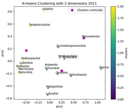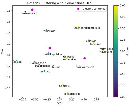 In this case, a well-known technique called K-means was applied to analyse those indicators for each of Poland’s regions, and found subgroups depending on the level of the development of environmental and socio-economic aspects. K-means is an unsupervised machine learning non-hierarchical cluster analysis technique. From the given number of clusters, the algorithm selects the centroids and assigns each element to the closest point. Then, the coordinates of the centre are changed, and this process is repeated until there is no change in the formed clusters [52]. The K-means Python library Scikit-Learn was used to implement this kind of analysis, which a widely used tool that supports this kind of problem.