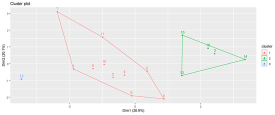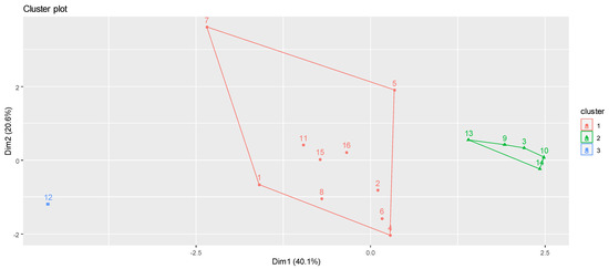 As a result of PAM clustering, Figure 7 and Figure 8 show the three clusters obtained for 2011 and 2021, respectively. It should be noted that there have been two migrations of regions to other clusters during the decade, affecting the Podkarpackie (id 9) and the Zachodniopomorskie regions (id 16). Regarding the comparison between the K-means and PAM methodologies in 12 cases (Table 1), there is agreement between them to confirm a region in one group or to migrate it to another.