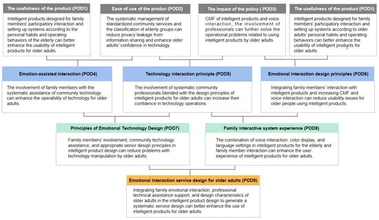 This paper is the result of a Chinese research project on the usability of intelligent products for older adults. The authors used Ibrahim’s [,] research question construct technique to classify journal articles based on the selected topic, using the novel “synthesis process of literature analysis”. The final theoretical construction was evaluated based on a synthesis of the various categories of the literature that were reviewed. Figure 2 depicts the points of departure (PODs). Each POD was created by combining different findings at each level. For example, POD 9 is the integration of family emotional interaction, professional technical assistance support, and design characteristics of older adults into the intelligent product’s design in order to generate a systematic service design that can enhance the use of intelligent products for older adults.