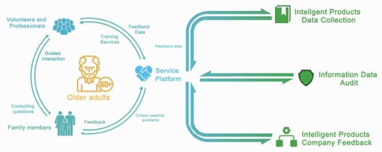 As an outcome of this research, a conceptual framework for an intelligent product service platform for older adults is proposed. The framework is primarily concerned with the nature of services, connecting various intelligent products to record the usage data of the products and the process of using them. It quickly solves the problem of older adults’ operational difficulties with big data, which are collected to identify and better understand critical needs and scenarios, and it also synthesizes various usability issues by analyzing the older adults’ feedback about the brand. This involvement of the community and back-end monitoring ensure the safeguarding of older adults’ data privacy.