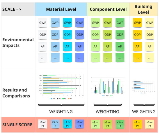 The need of a single score is stated in many studies such as [23,24,25,26]. As stated in Figure 1, in all levels in architecture, decision-makers may desire to make a comparison between or among different alternatives for the construction materials, building components and whole building alternatives. To decide the most sustainable alternative for the related level, LCA must be performed. The results of LCA analyses contain rankings according to impact categories. The number of impact categories studied may change from 7 to 15 or more. For a decision-maker, it is hard to decide on the material or component or the whole building alternative in terms of sustainability with 15 or more variables. As stated in the last row of Figure 1, weighting narrows down the pattern of options from matrices to a single item.