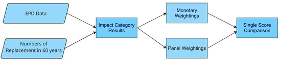 As stated in Figure 3, comparisons are made in two parts: (1) First, environmental data are gathered from EPDs. The numbers of replacements are calculated and demonstrated in Table 1 and Table 2. In the next step, the impact category results are calculated, taking into consideration their replacements. A comparison is made based on the EPD data throughout its life cycle; (2) Then, the calculated results from Part 1 are multiplied with monetary weightings of EPS, EVR and MMG and the panel weightings of YDED-TR, EF and BRE. In the next step, single-score results are analyzed, evaluated and compared; then, the conclusion is drawn. For the calculations to achieve single score, the formula below is followed: