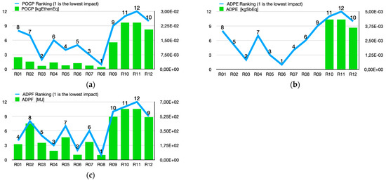 In Figure 5a, POCP results show that the highest negative impacts belong to metal profiles R11, R10, R12 and R09. There is a huge difference in the performances of metal profiles and the rest of the roof coverings. On the other hand, R08 has the lowest POCP impact. When ADPE is concerned (Figure 5b), three of the metal profiles have the highest negative impacts, namely R11, R10 and R12. On the contrary, R06 has the lowest impact on ADPE. For ADPF, seen in Figure 5c, similarly, metal profiles have the highest negative performances. Coated fiber cement slates have the lowest ADPF among others.