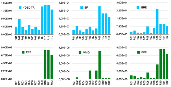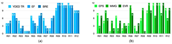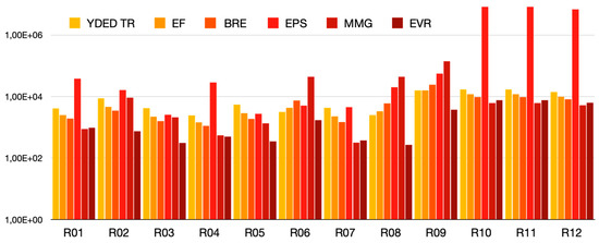 The results are given in Figure 6 below. When YDED-TR is concerned, the best performance belongs to R04 with the value of 2.42 × 104, while the worst performance belongs to R10 and R11 with the value of 1.69 × 104. In the EF results, the best and worst performances belong to R04 with 1.46 × 103 and R09 with 1.60 × 104. The BRE results indicate a similarity with the EF results in terms of best and worst performances. R04 has the best performance in the EF weightings (1.12 × 103), while R09 has the worst performances in the EF weightings (2.41 × 104).