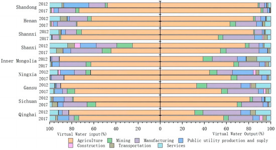 4.3. Virtual Water Flow Patterns in the Yellow River Basin by Sector
