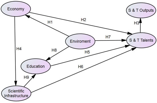 Scientific infrastructure positively affects science and technology talent, while the environment and its other effects are unchanged (denoted as H6). The EEE model uses to represent H6.