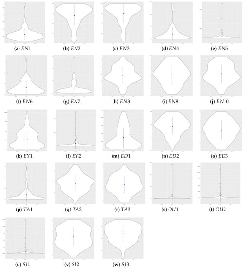 Furthermore, violin plots (Hintze and Nelson 1998) [30] are used to present the above 23 observed variables (as can be seen in Figure 2). As a combination of both box plots and density plots, violin plots provide two kinds of information for each observed variable. On the one hand, the length of each violin on the vertical axis provides the range of the corresponding observed values. As in a box plot, the 25th, 50th and 75th percentiles of each observed variable are calculated as the lower, median and upper hinge, and then the smallest (largest) observation greater (less) than or equal to the lower (upper) hinge − (+) 1.5 ∗ IQR is defined as the lower (upper) adjacent value.