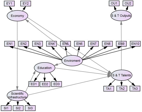 Having formulated nine research hypotheses regarding the environment and its effects, the EEE conceptual framework is established as shown in Figure 1. Environment is the unique exogenous variable, while economy, scientific infrastructure, education, science and technology talent and science and technology output are endogenous variables. These exogenous and endogenous variables are all constructs and, thus, cannot be observed directly. They are so-called latent variables. For further investigation, design indicators are needed to support each construct as shown in Figure 1.