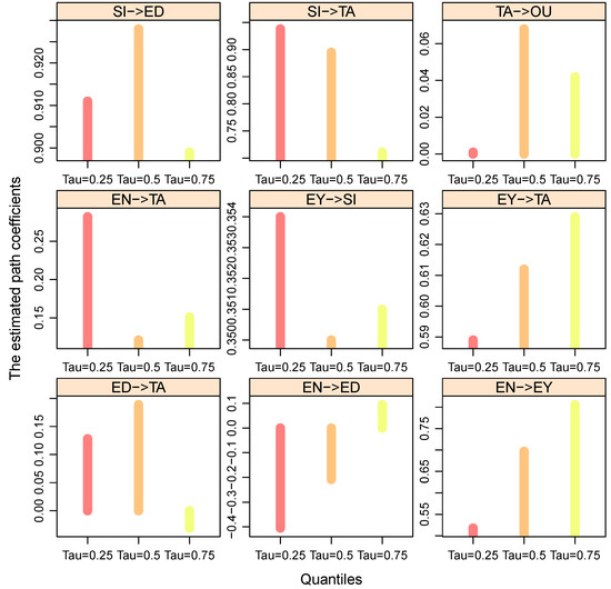 The estimated path coefficients of the quantile-type EEE model at quantile levels 0.25, 0.50 and 0.75.