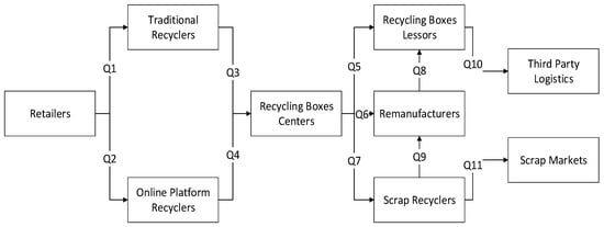 The project studied in this paper is a reverse logistics network for the recycling of recycling boxes. The participating parties are retailers, traditional recyclers, online platform recyclers, recycling boxes centers, recycling boxes lessors, remanufacturers, scrape recyclers, third party logistics, and scrap markets. The business processes of these nine participants are shown in Figure 1. Q stands for the number of recycling boxes. Waste material is still recorded according to individual boxes.
