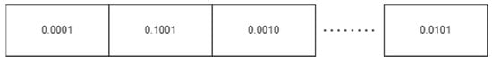 The algorithm in this paper uses a four-digit floating-point number with a value range of 0 to 1 coding to express individual genes. This model has eight variables to solve, so each individual’s character is expressed by eight floating-point numbers. The more digits of floating point numbers, the higher the algorithm’s accuracy and the final solution will be. However, the corresponding amount of calculation will be enormous. Considering the parameter units in the model, there is no need for too-accurate solution results; four-digit floating point numbers are sufficient to solve a relatively accurate result in the problem in this paper. The individual gene encoding is shown in Figure 3.