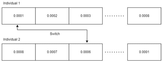 This step mimics the phenomenon of gene crossover in nature. In binary coding, a segment of two chromosomes is generally selected for random exchange. However, the algorithm in this paper is based on floating-point coding. In the crossover process, if the chromosome of the exact individual is going to crossover, another chromosome will be selected randomly from another random individual. After exchanging the value of these two chromosomes, the crossover process is completed. The example of crossover process is shown in Figure 4.