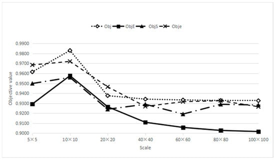 Among multiple example scales, the 10 × 10 example scale is the most consistent with this model because it has the highest objective value, while the value of the increased example scale is lower and remains stable.