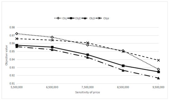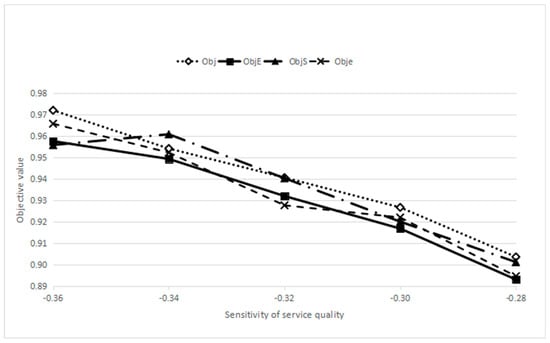 In the environment where dual-channel recyclers compete with each other, as price competition becomes more and more fierce, consumers are more and more sensitive to price; in particular, the change of the sensitivity of the other party’s product price will lead to the change of the multi-objective and single-objective values. As shown in Table 7 and Figure 7, the overall goal and the value of the three levels of goals all show a downward trend with the improvement of the sensitivity of price competition. This is because changes in competitors’ prices affect recyclers’ demand for their products more significantly than their own. In addition, the decline in demand will lead to an increase in the proportion of fixed costs and a decline in profitability; Obj fell by 4.6321%, Obje by 3.46%, ObjS by 4.0876%, and Obje by 2.783%. The data show that multi-objective price sensitivity has the greatest impact, followed by social objectives, economic objectives, and finally environmental objectives. This result was roughly in line with expectations, except that the social goals varied more than the economic ones.