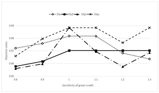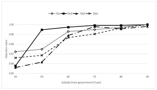 As policy makers and facilitators, governments need to subsidize recyclers, recycling centers, and others to improve the sustainability of the entire supply chain. Chang et al. [39] used the global Malmquist–Luenberger (GML) index method to explore the significant symbolic effects of subsidy and tax rebate policies on the R&D efficiency of green firms. The results show that under the significant level of 10%, subsidies have a great effect on enterprises’ scientific research investment, personnel training, and other aspects. Similarly, in the aspect of commercial banks, ESG grade will change the green credit intensity of banks to enterprises. This section will discuss the impact of changes in government subsidies and green credit on the multi-objective value of the system.
