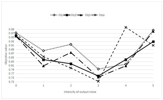 With the increase in the intensity of white noise interference, objective value presents a downward trend, indicating that the increase in environmental uncertainty will lead to damage to the overall interests. Nevertheless, sustainability becomes difficult to predict after the intensity reaches a certain point because of the extreme values.