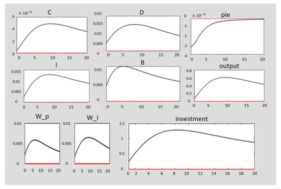 In the framework of the instantaneous reaction functions obtained from the simulated model, the reaction of the variables total Consumption (C), Non-Oil Production (output), Investment, Deposit (D), Real Wage of a Risky Household (w_i) Risk-Averse Household Wages (w_p), Employment (l), Lending Services (B), and Inflation Rate (pi) is reported as a positive technology shock as a standard deviation in Figure 2.