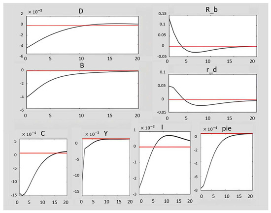 As can be seen in Figure 3, although the restrictive monetary shock is accompanied by an increase in interest rates on deposits (rd), due to the decrease in the level of production of firms, household incomes have decreased, which has reduced household savings in the form of bank deposits (D). Further, deposits are the most important source of financing for the supply of lending services, so the supply of loans (B) decreases. On the other hand, the cost of borrowing for lending applicants increases with the application of restrictive monetary shocks, followed by an increase in interest rates on bank loans (Rb), which in turn reduces the demand for loans. In fact, the application of a restrictive monetary policy causes the contraction of bank reserves in the direction of both bank liabilities (deposits) and bank assets (loans). With the decrease in the supply of loans, investment and production have decreased, and as can be seen from the graphs obtained from the research results, the economy will continue to face consumption, employment, and inflation.