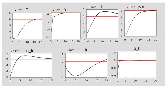 The effect of restrictive monetary shock on firm variables is shown in Figure 4. Restrictive monetary policy and the consequent increase in interest rates are generally accompanied by a decrease in asset prices (q_k), and with a decrease in asset prices, the value of the borrower’s collateral (q_h) decreases, and then the amount of borrowers’ loans decreases. As a result, firms are forced to reduce investment, which in turn will lead to a decrease in capital stock (k), production, and employment and inflation in the economy.