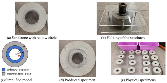 The practical tunnel construction, on the whole, can be simplified to be illustrated in Figure 1. In order to study the dynamic response characteristics of the primary support structure, the practical tunnel construction was simplified to be the combination of the surrounding rock and primary support, which was a two-layer structure, simulated by the concentric annular sandstone and cement mortar in this paper. The surrounding rock layer was made of sandstone with good integrity and relatively uniform materials. The internal primary support layer was represented by cement mortar, the particle size of which less than 1 mm. The two layers were bonded by cement, whose strength was 42.5 MPa (P.O 42.5 ordinary Portland cement). According to the industrial standard of the People’s Republic of China [21], the proportion of cement: sand: water = 1:1.66:0.41. The whole process of producing the specimen was carried out by the pouring method, and the testing specimens after pouring were positioned in the place with the curing humidity ≥95% and the temperature was maintained at 20 °C in the environment for 28 d. The manufacturing process of the testing specimen is shown in Figure 2. There were five kinds of testing specimens distinguished by the dimensions after forming, the designing parameters of which are shown in Table 1.