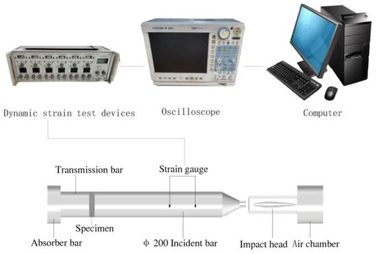 The indoor experiments of the dynamic response of the combination of the primary support and the surrounding rock were carried out with the self-developed variable diameter split Hopkinson pressure bar (SHPB) system, shown in Figure 3. The special SHPB system is mainly composed of the air chamber, impact head, incident bar, transmit bar, absorber bar, dynamic strain test device, oscilloscope and data-collection center, etc. The material of the bars is consistent with those of conventional SHPB devices, which is made of 40 Cr alloy steel with a density of 7810 kg/m3, elastic modulus of 210 GPa and longitudinal wave velocity of 5410 m/s [22]. The incident bar of the system is a variable cross-section cylindrical bar, so as to adapt to the specimens with different diameters, which has been proven to conform to the one-dimensional stress wave theory [23,24]. The biggest diameter of the incident bar is 200 mm with a length of 1000 mm, the length of the reducing part is 150 mm and the minimum diameter is designed to be 50 mm with the length of 50 mm to accommodate the size of the impact head. The frame of the system, positioned on the test bench, is welded to the base plate to support the variable diameter bar, so that the bar is convenient for coaxial calibration. The bottom plate is equipped with a pulley, which can move in the axial direction. During the tests, the dynamic strain signals, caused by the impact load of the impact head, in all bars can be detected by each strain gauge stuck on the corresponding bar, and amplified and displayed by the dynamic strain test devices and Oscilloscope, which can be used to calculate the dynamic stress and strain of the testing specimen.