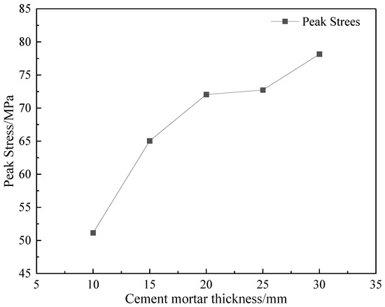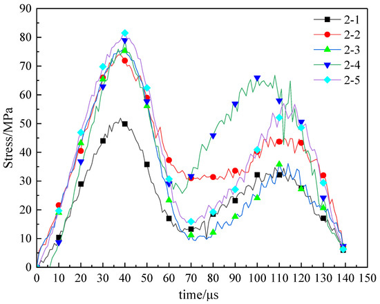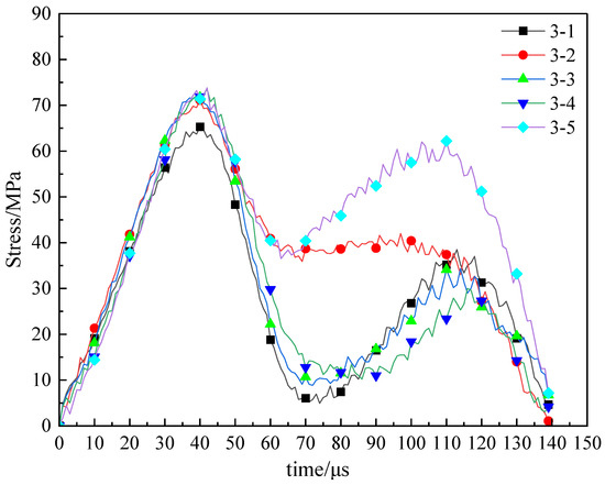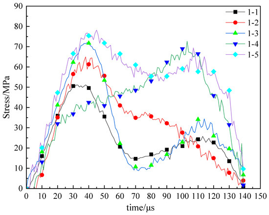 The stress–time history curves of the first group of specimens are shown in Figure 4, the dynamic strength of each specimen are quite different from each other, but the curves change with a uniform law. There is a simple rule that these stress curves are almost similar to saddle shapes with two different peak values. According to the following failure diagrams of the specimens, the specimens were damaged to different degrees under the same impact load, which indicates that the change ofin cement mortar thickness is related to the stability of the specimen.