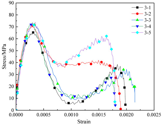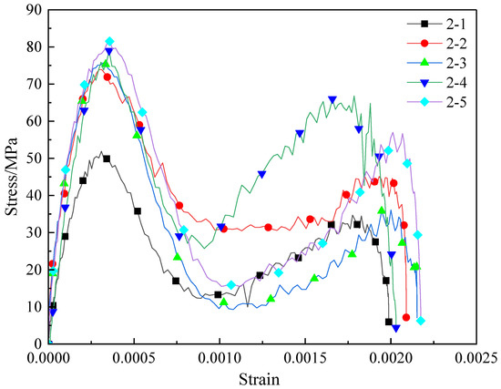 According to the dynamic strain signals recorded in each bar during the tests, the dynamic stress and dynamic strain of the specimen can be calculated based on the three waves method or two waves method [23,24]. Then, the stress–strain curves of the three corresponding groups of the specimens in this paper were obtained and shown in Figure 7, Figure 8 and Figure 9.