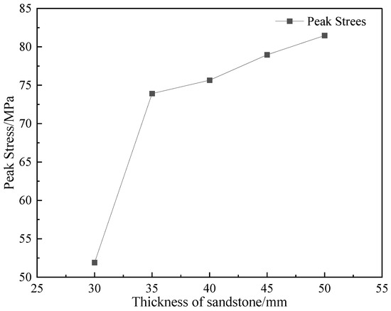 It can be seen from Figure 7, Figure 8 and Figure 9 that the stress–strain curves of the three groups of specimens are basically the same in its shape. However, the curves show differences in detail due to the different thickness proportions of the two materials, sandstone and cement mortar. When the dynamic strain of the specimen is greater than 0.025%, the stress–strain curve drops sharply, which indicates that the impact load has exceeded the overall ultimate strength of the testing specimens at this time, and the plastic deformation stage formed to generate irreversible cracks inner the specimen, causing serious damage to the combination of the primary support and surrounding rock. The peak values of the curves are different for all incomplete failure specimens of the three groups, which indicates that the maximum dynamic strength of the combination of surrounding rock and the primary support is affected by the support size.